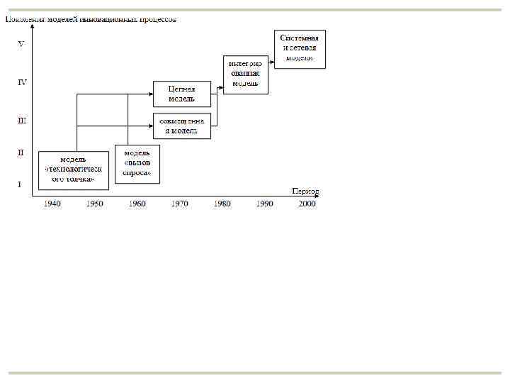 МОДЕЛИ ИННОВАЦИОННОГО ПРОЦЕССА Линейная (до 1960 -х гг. ); Рыночная (1960 -е гг. ); Интерактивная (1970 -е гг. ); Интеграционная (1980 -е гг. ); Сетевая (1990 -е гг. ); Информационная (2000 - наст. время).