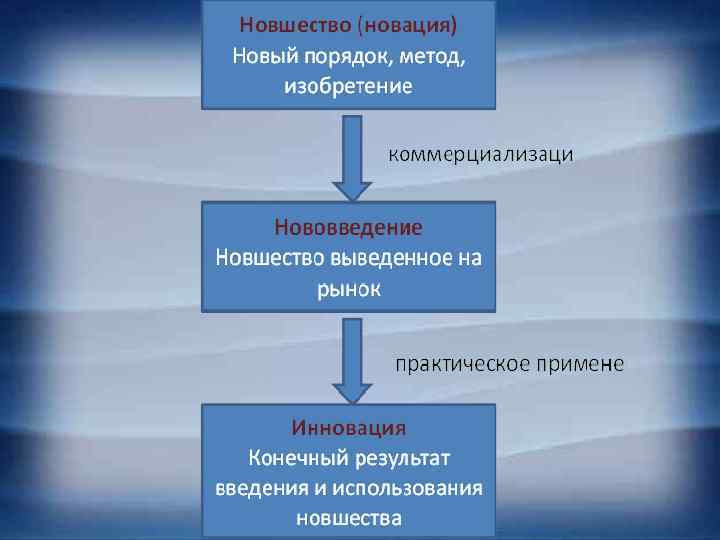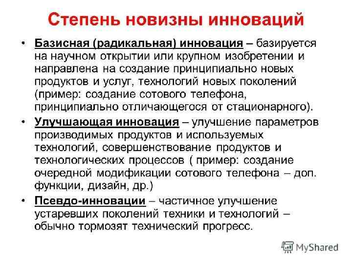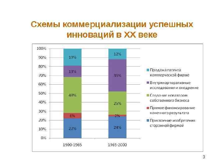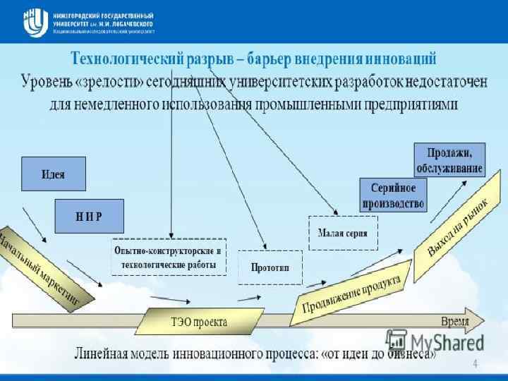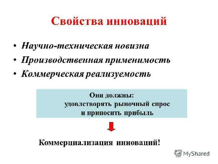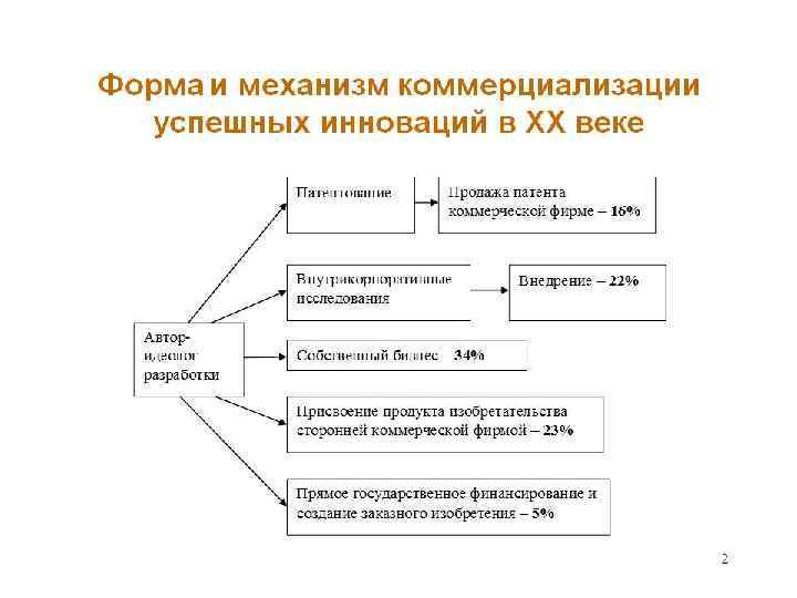 Передача технологии 1. 2. 3. 4. 5. 6. 7. 8. Создание идеи Технологическая разработка идеи, научные исследования Расчет эффективности изобретения Создание опытно-конструкторского образца Написание технологической документации Поиск потенциальных покупателей разработки Проведение переговоров Адаптация опытно-конструкторского образца к технологическим возможностям покупателя технологии 9. Создание экспериментального производства на базе клиента 10. Полная адаптация разработки к экспериментальным условиям производства 11. Заключение сделки купли-продажи технологии 12. Выведение инновации на массовое (серийное) производство, превращение технологии в инновацию