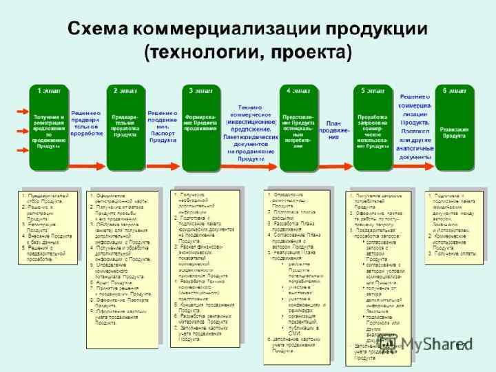 Коммерциализация технологий 1. Создание идеи 2. Технологическая разработка идеи, научные исследования 3. Расчет эффективности изобретения 4. Создание опытно-конструкторского образца 5. Написание технологической документации 6. Поиск потенциальных покупателей разработки 7. Проведение переговоров 8. Заключение сделки купли-продажи технологии
