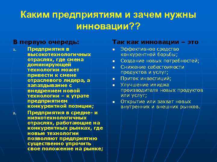 Каким предприятиям и зачем нужны инновации? ? В первую очередь: 1. 2. Предприятия в высокотехнологичных отраслях, где смена доминирующей технологии может привести к смене отраслевого лидера, а запаздывание с внедрением новой технологии – к утрате предприятием конкурентной позиции; Предприятия в средне- и низкотехнологичных отраслях, работающие на конкурентных рынках, где новые технологии позволяют предприятию существенно упрочить свое положение на рынке; Так как инновации – это n n n Эффективное средство конкурентной борьбы; Создание новых потребностей; Снижение себестоимости продуктов и услуг; Приток инвестиций; Улучшение имиджа производителя новых продуктов или услуг; Открытие или захват новых внутренних и внешних рынков.