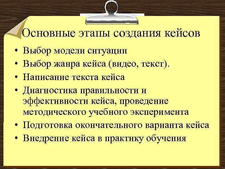 Основные этапы создания кейсов • • Выбор модели ситуации Выбор жанра кейса (видео, текст). Написание текста кейса Диагностика правильности и эффективности кейса, проведение методического учебного эксперимента • Подготовка окончательного варианта кейса • Внедрение кейса в практику обучения