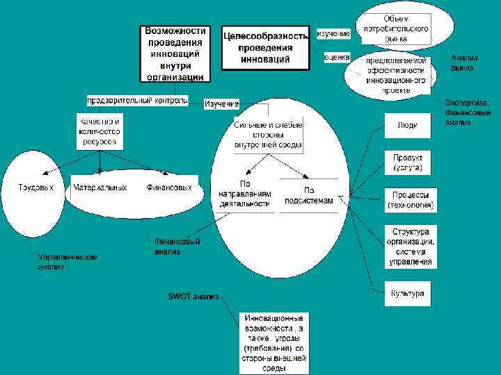 n n n К важнейшим подсистемам, наиболее подверженным изменениям относятся: -люди, процессы (технологии), культура, структура и система управления организацией. Для успешной инновационной деятельности требуется наличие такой сильной стороны организации, как восприимчивость ее работников к нововведениям. Те организации, в которых люди заранее настроены на сопротивление предстоящим изменениям, имеют мало шансов на успех. - В третьих, проводится SWOT-анализ Цель- сопоставления сильных и слабых сторон фирмы с выявленными ранее инновационными возможностями. На основании такого анализа принимаются альтернативные варианты решений по реализации инноваций и строятся инновационные стратегии.