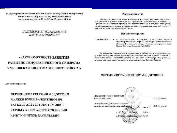 Инновационные технологии, применяемые в работе Центра: • Способ лечения синдрома Меллори-Вейсса диовином (Патент РФ);