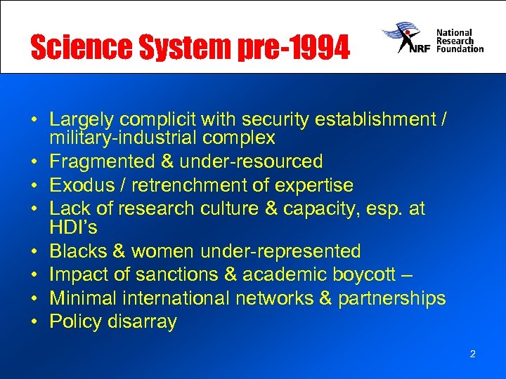 Science System pre-1994 • Largely complicit with security establishment / military-industrial complex • Fragmented & under-resourced • Exodus / retrenchment of expertise • Lack of research culture & capacity, esp. at HDI’s • Blacks & women under-represented • Impact of sanctions & academic boycott – • Minimal international networks & partnerships • Policy disarray 2