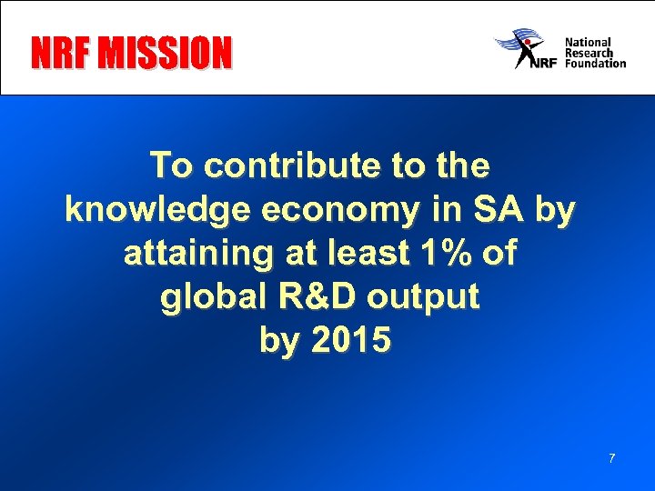 NRF VISION 2015 World-class research Transformed society Sustainable environment 6