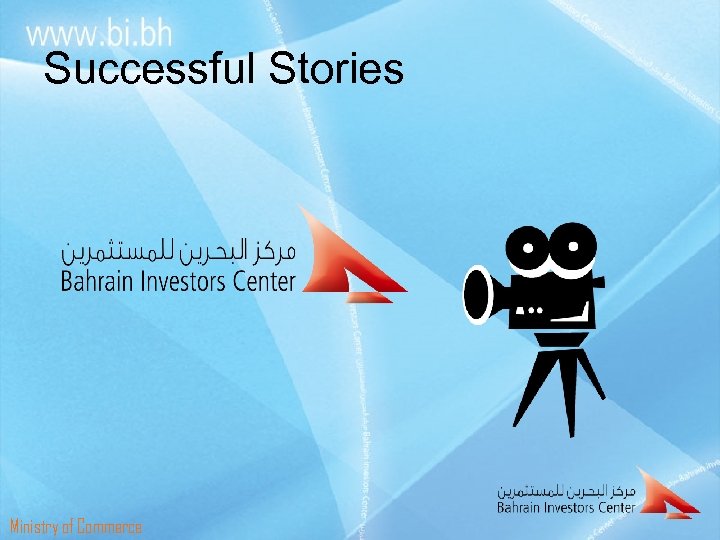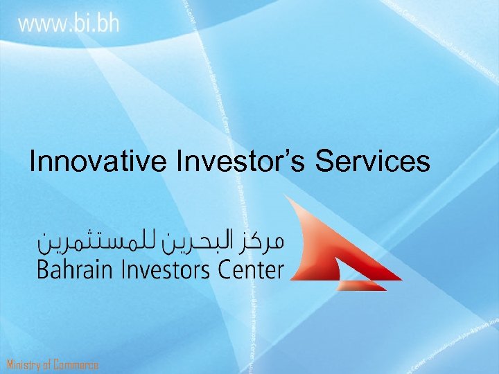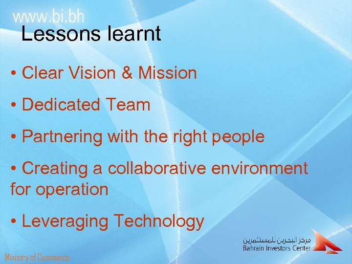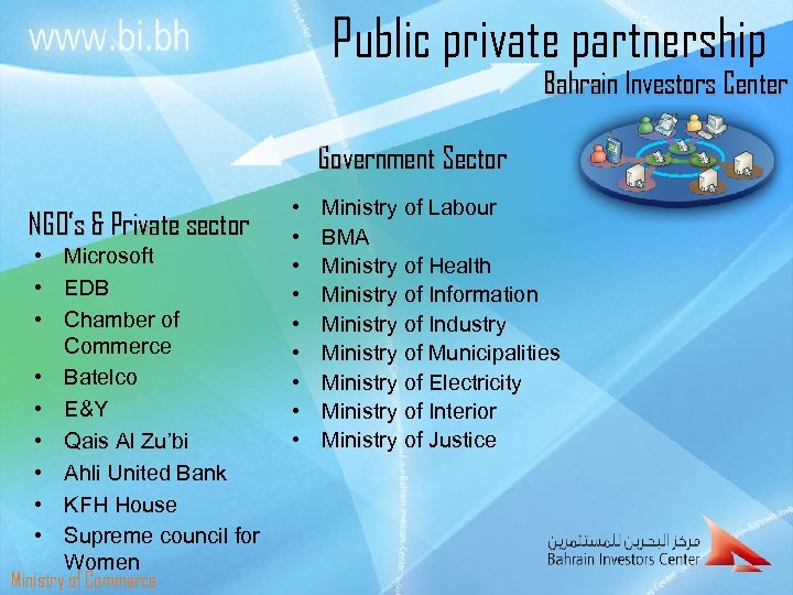 Public private partnership Bahrain Investors Center Government Sector NGO’s & Private sector • Microsoft • EDB • Chamber of Commerce • Batelco • E&Y • Qais Al Zu’bi • Ahli United Bank • KFH House • Supreme council for Women Ministry of Commerce • • • Ministry of Labour BMA Ministry of Health Ministry of Information Ministry of Industry Ministry of Municipalities Ministry of Electricity Ministry of Interior Ministry of Justice