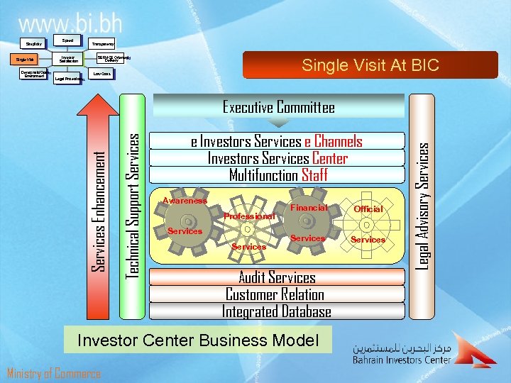 Simplicity Single Visit Democratic/Open Environment Speed Transparency Investor Satisfaction Legal Protections SERVICE Oriented Delivery Single Visit At BIC Low Costs e Investors Services e Channels Investors Services Center Multifunction Staff Awareness Professional Services Financial Official Services Audit Services Customer Relation Integrated Database Investor Center Business Model Ministry of Commerce Legal Advisory Services Technical Support Services Enhancement Executive Committee