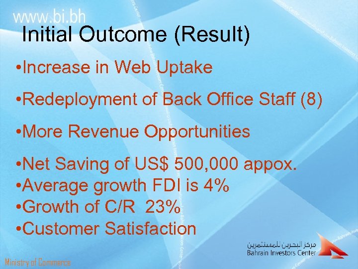 Initial Outcome (Result) • Increase in Web Uptake • Redeployment of Back Office Staff (8) • More Revenue Opportunities • Net Saving of US$ 500, 000 appox. • Average growth FDI is 4% • Growth of C/R 23% • Customer Satisfaction Ministry of Commerce