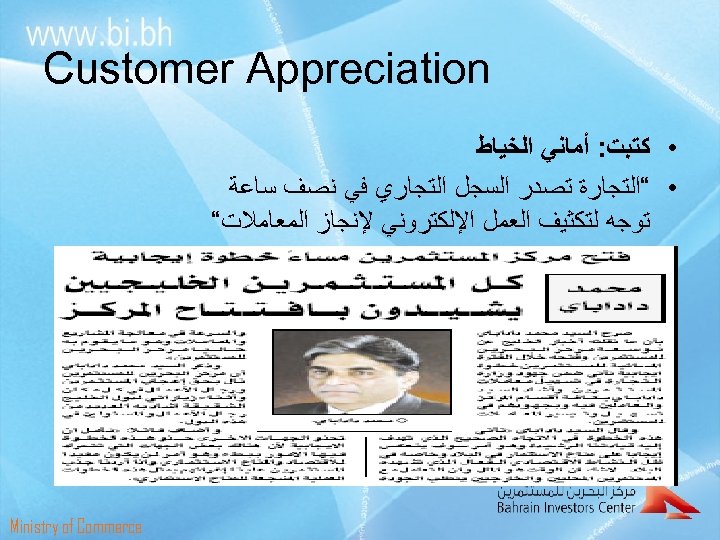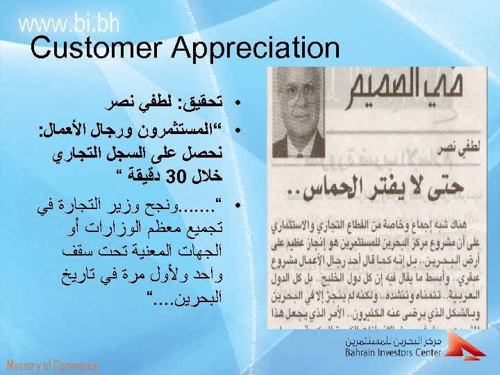 Customer Appreciation • ﺗﺤﻘﻴﻖ: ﻟﻄﻔﻲ ﻧﺼﺮ • “ﺍﻟﻤﺴﺘﺜﻤﺮﻭﻥ ﻭﺭﺟﺎﻝ ﺍﻷﻌﻤﺎﻝ: ﻧﺤﺼﻞ ﻋﻠﻰ ﺍﻟﺴﺠﻞ ﺍﻟﺘﺠﺎﺭﻱ ﺧﻼﻝ 03 ﺩﻗﻴﻘﺔ “ • “. . . . ﻭﻧﺠﺢ ﻭﺯﻳﺮ ﺍﻟﺘﺠﺎﺭﺓ ﻓﻲ ﺗﺠﻤﻴﻊ ﻣﻌﻈﻢ ﺍﻟﻮﺯﺍﺭﺍﺕ ﺃﻮ ﺍﻟﺠﻬﺎﺕ ﺍﻟﻤﻌﻨﻴﺔ ﺗﺤﺖ ﺳﻘﻒ ﻭﺍﺣﺪ ﻭﻷﻮﻝ ﻣﺮﺓ ﻓﻲ ﺗﺎﺭﻳﺦ ﺍﻟﺒﺤﺮﻳﻦ. . “ Ministry of Commerce