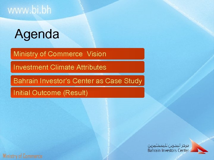 Agenda Ministry of Commerce Vision Investment Climate Attributes Bahrain Investor’s Center as Case Study Initial Outcome (Result) Ministry of Commerce
