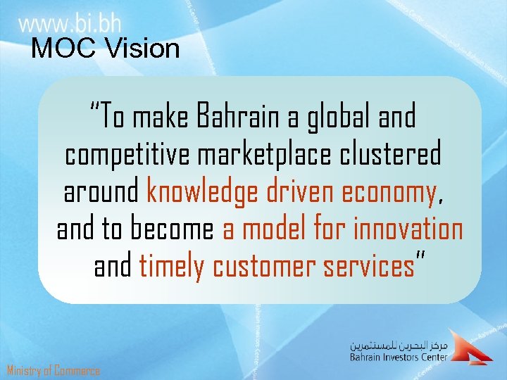 MOC Vision “To make Bahrain a global and competitive marketplace clustered around knowledge driven economy, and to become a model for innovation and timely customer services” Ministry of Commerce