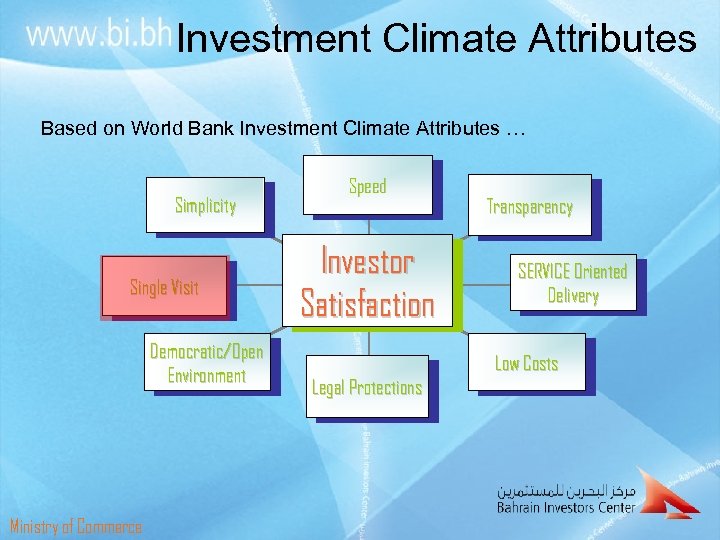 Investment Climate Attributes Based on World Bank Investment Climate Attributes … Simplicity Single Visit Democratic/Open Environment Ministry of Commerce Speed Investor Satisfaction Transparency SERVICE Oriented Delivery Low Costs Legal Protections