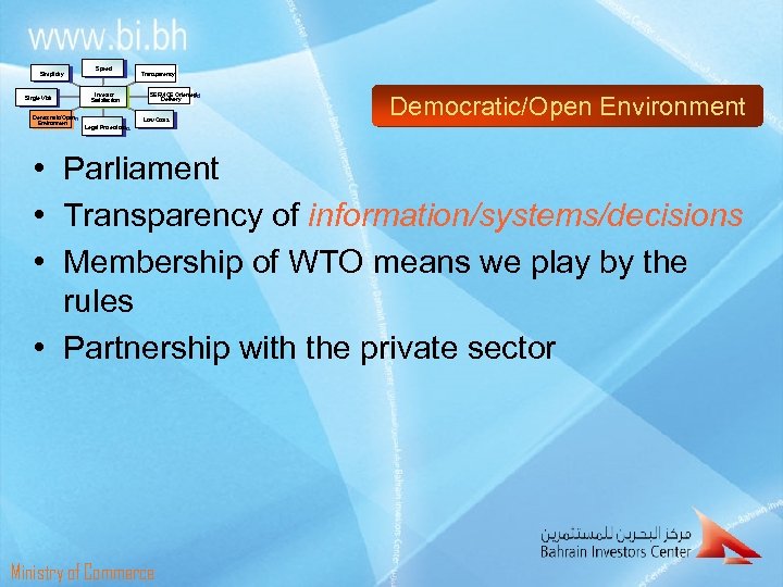 Simplicity Single Visit Democratic/Open Environment Speed Investor Satisfaction Legal Protections Transparency SERVICE Oriented Delivery Low Costs Democratic/Open Environment • Parliament • Transparency of information/systems/decisions • Membership of WTO means we play by the rules • Partnership with the private sector Ministry of Commerce