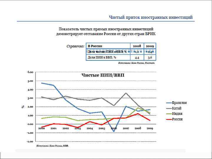 Россия в 2010 году занимала восьмое место среди основных получателей ПИИ в мире. К началу финансового кризиса в России наблюдался заметный рост иностранных инвестиций, в том числе прямых (пик 70, 3 млрд. долл. в 2007 году). Но первые же месяцы кризиса вызвали огромный отток иностранного капитала. Объем прямых иностранных инвестиций в 2010 г. , по сравнению с 2009 г. , снизился на 13, 2%. Доля прямых инвестиций, отражающая интерес инвесторов к вложениям в реальный сектор экономики, в 2010 г. продолжала сокращаться и составила 38, 7% против 40, 7% годом ранее. Это свидетельствует, что Россия пока рассматривается только как временное вложение капитала.