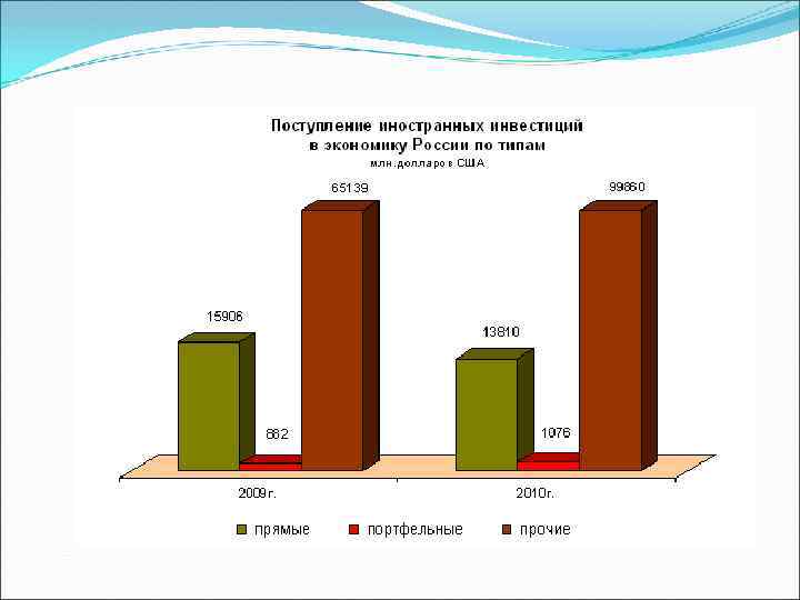 Вплоть до 2006 г. доля портфельных инвестиций составляла менее 1 % от всех иностранных инвестиций в российскую экономику. Некоторый рост наблюдался до кризиса 2008 г. В 2009 году портфельные инвестиции упали на 37, 7% по сравнению с 2008 годом. Портфельные инвестиции в 2010 году составили $1, 076 млрд. – на 21, 9% больше, чем в 2009 г. Это обусловлено ростом цен на нефть, и, соответственно, интересом глобальных инвесторов к России. Однако, инвестиции в акции и паи составили $344 млн. , упав на 9%. За 2011 й год в экономику России поступило портфельных инвестиций на сумму 805 млн. долл. , или 25, 1% по сравнению с предыдущим годом. В общем объеме иностранных инвестиций их доля составляет сейчас 7, 5 %.