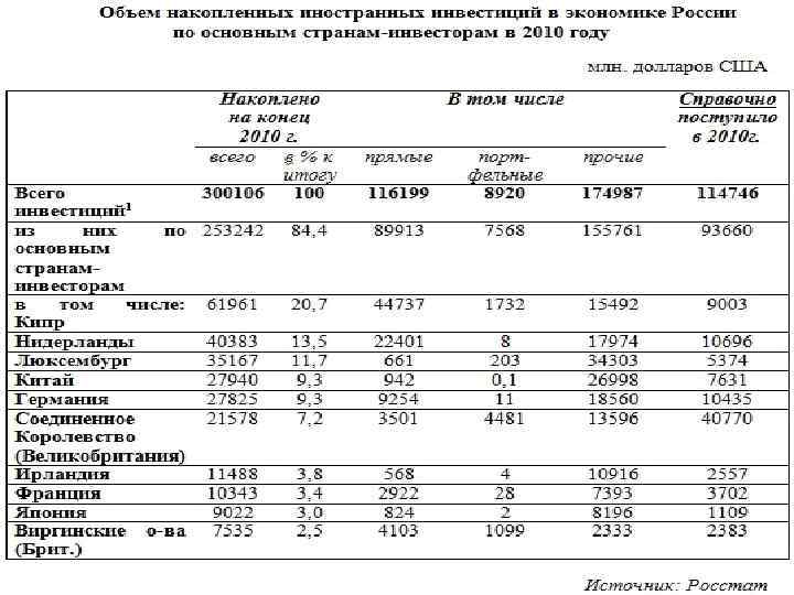 По данным Госкомстата РФ, по состоянию на конец 2011 г. объем иностранных инвестиций за год составил 190, 6 млрд. долл. Накопленный иностранный капитал в экономике России составил 347, 2 млрд. долларов США, что на 15, 7 % больше по сравнению с соответствующим периодом предыдущего года. Наибольший удельный вес в накопленном иностранном капитале приходился на прочие инвестиции, осуществляемые на возвратной основе $198, 3 млрд. (+1, 2%), объем прямых инвестиций составил $139, 2 млрд. (+1, 4%), портфельных $9, 7 млрд. (-0, 2%) %. Объем инвестиций из России, накопленных за рубежом, на конец 2011 года составил 106, 7 млрд. долл. , из них оффшоры на Кипре – 78, 2 млрд. долл. , в Нидерландах 49, 1 млрд. долл. В целом рост выводимых за рубеж капиталов из России в 2011 году составил 57, 6% по сравнению с 2010 м годом.