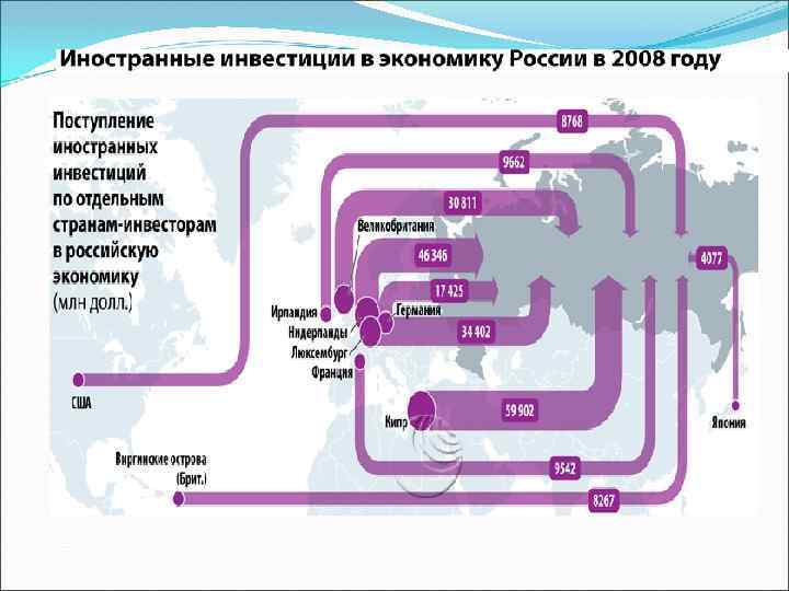 В 2010 г. в экономику России поступили инвестиции из 127 стран мира. Значительное увеличение поступления иностранного капитала в 2010 г. по сравнению с 2009 г. наблюдалось из Соединенного Королевства (Великобритании) (в 6, 3 раза), Ирландии (в 3, 4 раза), Франции (на 48, 7%), Германии (на 41, 7%); наибольшее снижение - из Японии (на 63, 3%), Люксембурга (на 54, 2%), США (на 24, 2%), Китая (на 21, 8%). Государства-участники СНГ вложили в 2010 г. в экономику России 4, 7 млрд. долларов США инвестиций (4, 1% ИИ в российскую экономику). Наибольшая доля поступления иностранных инвестиций из государствучастников СНГ в 2010 г. приходилась на Беларусь - 41, 1%, Казахстан - 31, 7%, Украину - 12, 3%.
