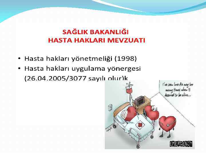 Ülkemizde Hasta Hakları Anayasa (56. Madde) Tıbbi Deontoloji Tüzüğü (1960) Hasta Hakları Yönetmeliği(01. 08. 1998) Hasta Hakları Uygulama Yönergesi(26. 04. 2005) ile düzenlenmiştir.