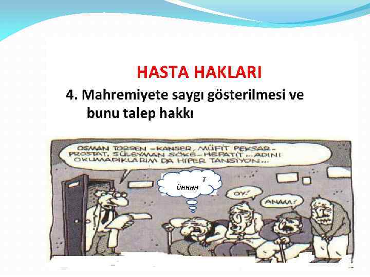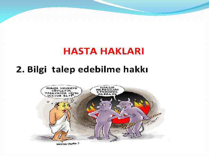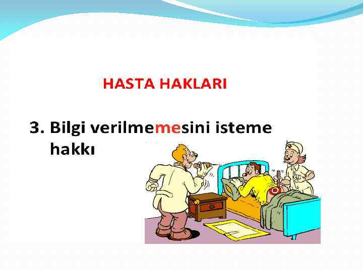 3) Sağlık Çalışanlarını Bilgilendirme Sorumluluğu • Hasta; şikayetlerini, daha önce geçirdiği hastalıkları, yatarak herhangi bir tedavi görüp görmediğini, eğer varsa halen kullandığı ilaçları ve tüm sağlığıyla ilgili bilgileri tam, eksiksiz vermelidir.