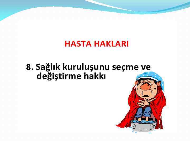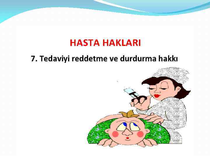 6) Tetkik ve Tedavi Giderlerini Karşılama Sorumluluğu • Hasta sağlık kuruluşuna başvurduğu zaman giderleri ne şekilde karşılayacağını bildirmelidir. • Ücretsiz tedavi olmaya hak kazanan hastalar bu haklarını belgelerle delillendirmelidir.