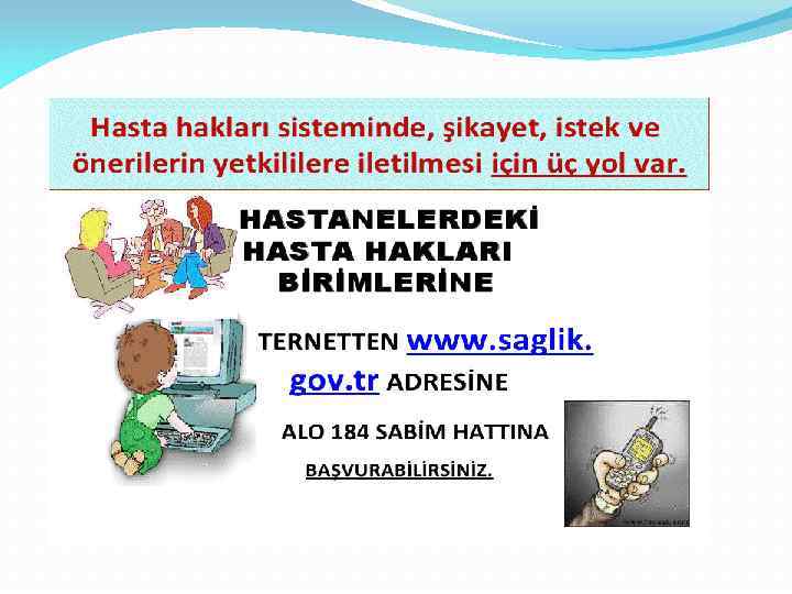 • Hasta Hakları Kurulunun Görevleri • Hasta hakları ihlali sebebiyle gelen başvuruları değerlendirip sonuçlandırmak. • Hasta hakları uygulamalarının geliştirilmesi ve sağlık kurumlarındaki aksaklıkların giderilmesi için önerilerde bulunmak