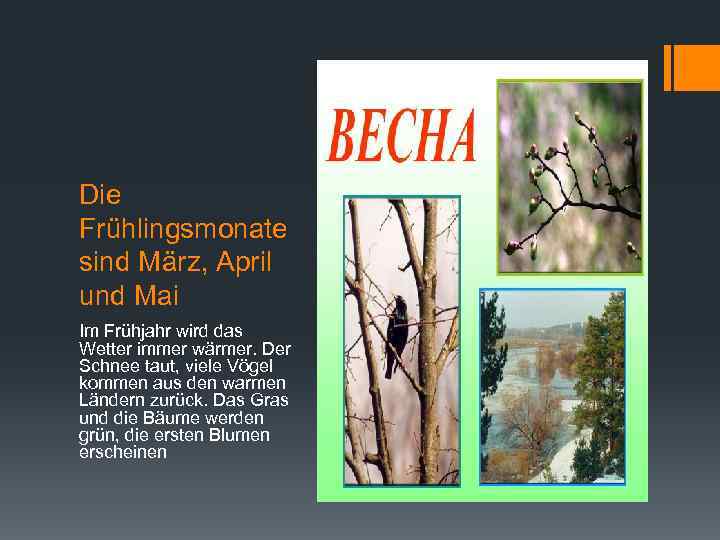 Die Frühlingsmonate sind März, April und Mai Im Frühjahr wird das Wetter immer wärmer. Der Schnee taut, viele Vögel kommen aus den warmen Ländern zurück. Das Gras und die Bäume werden grün, die ersten Blumen erscheinen