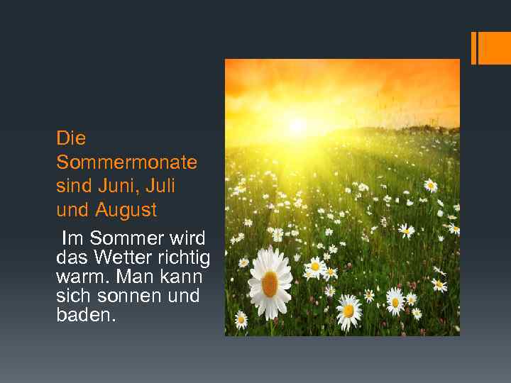Die Sommermonate sind Juni, Juli und August Im Sommer wird das Wetter richtig warm. Man kann sich sonnen und baden.
