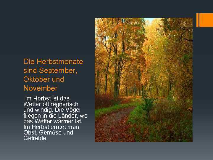 Die Herbstmonate sind September, Oktober und November Im Herbst ist das Wetter oft regnerisch und windig. Die Vögel fliegen in die Länder, wo das Wetter wärmer ist. Im Herbst erntet man Obst, Gemüse und Getreide.