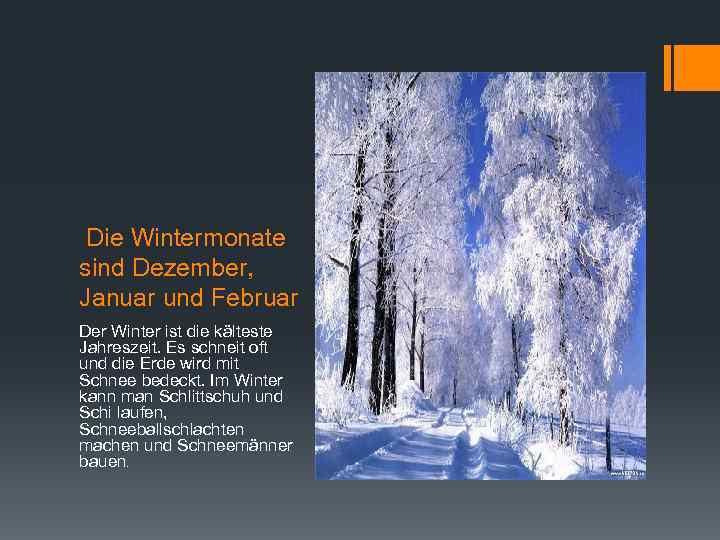 Die Wintermonate sind Dezember, Januar und Februar Der Winter ist die kälteste Jahreszeit. Es schneit oft und die Erde wird mit Schnee bedeckt. Im Winter kann man Schlittschuh und Schi laufen, Schneeballschlachten machen und Schneemänner bauen.