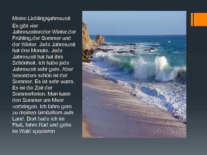 Meine Lieblingsjahreszeit Es gibt vier Jahreszeiten: der Winter, der Frühling, der Sommer und der Winter. Jede Jahreszeit hat drei Monate. Jede Jahreszeit hat ihre Schönheit. Ich habe jede Jahreszeit sehr gern. Aber besonders schön ist der Sommer. Es ist sehr warm. Es ist die Zeit der Sommerferien. Man kann den Sommer am Meer verbringen. Ich fahre gern zu meinen Großeltern aufs Land. Dort bade ich im Fluß, fahre Rad und gehe im Wald spazieren
