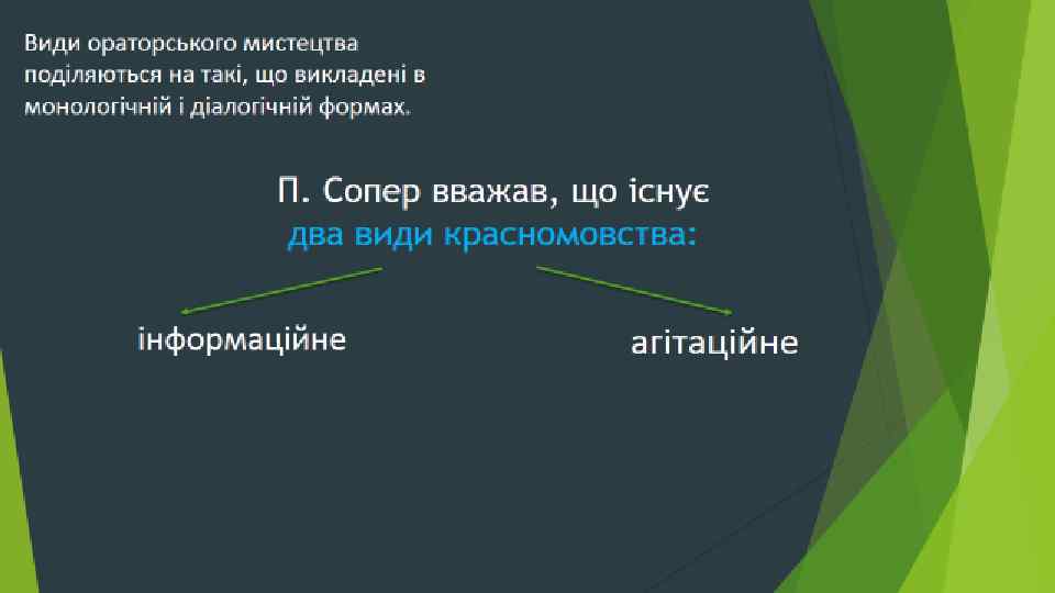 Лекційно-пропагандистське красномовство Цей вид ораторського мистецтва включає три основні підвиди: • науково-теоретичні лекції; • науково-популярні лекції (лекція-концерт, кінолекція, лекція-екскурсія); • науково-методичні лекції.
