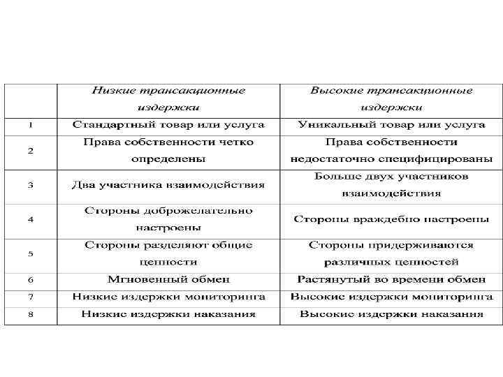 Рыночные трансакционные издержки • Издержки поиска информации об альтернативных сделках • Издержки измерения количественных и качественных характеристик блага • Издержки ведения переговоров и заключения контракта • Издержки контроля за соблюдением контракта • Издержки защиты контракта от посягательства третье стороны