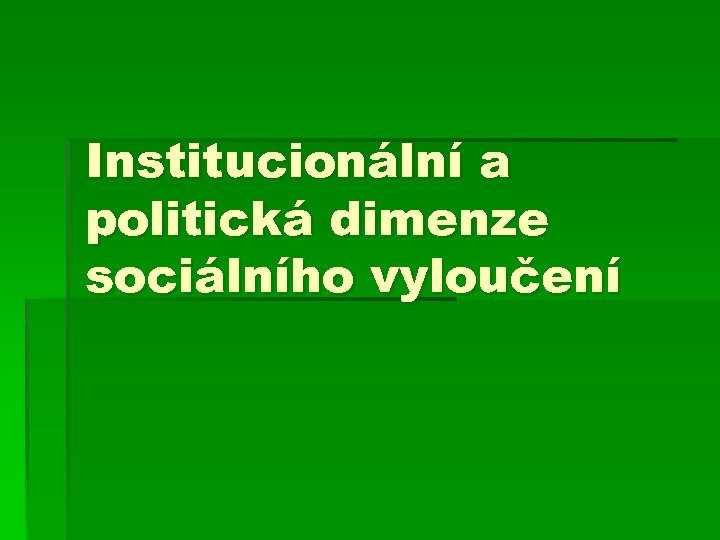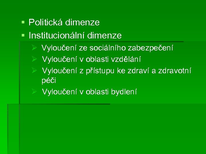 § Politická dimenze § Institucionální dimenze Ø Vyloučení ze sociálního zabezpečení Ø Vyloučení v oblasti vzdělání Ø Vyloučení z přístupu ke zdraví a zdravotní péči Ø Vyloučení v oblasti bydlení