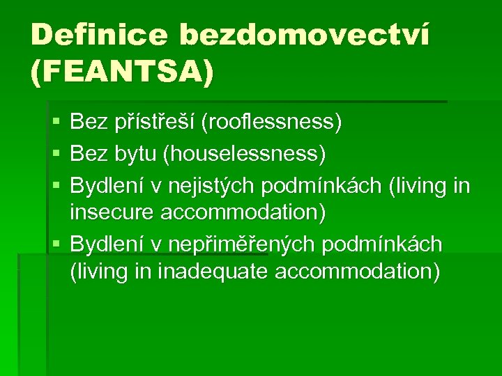 Definice bezdomovectví (FEANTSA) § § § Bez přístřeší (rooflessness) Bez bytu (houselessness) Bydlení v nejistých podmínkách (living in insecure accommodation) § Bydlení v nepřiměřených podmínkách (living in inadequate accommodation)
