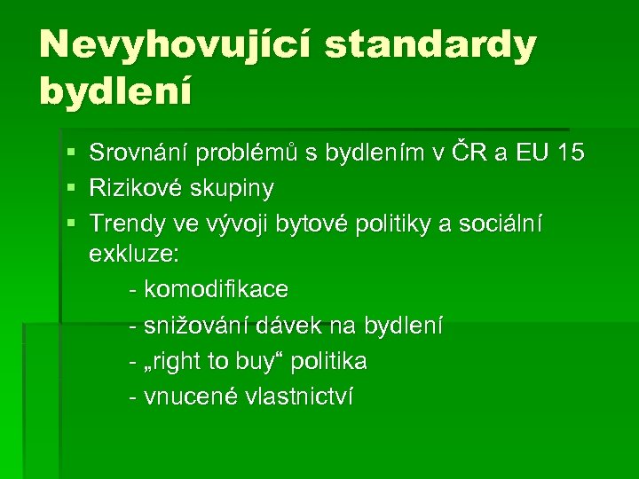 Nevyhovující standardy bydlení § Srovnání problémů s bydlením v ČR a EU 15 § Rizikové skupiny § Trendy ve vývoji bytové politiky a sociální exkluze: - komodifikace - snižování dávek na bydlení - „right to buy“ politika - vnucené vlastnictví