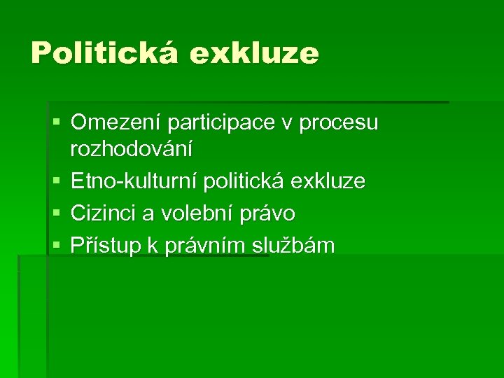 Politická exkluze § Omezení participace v procesu rozhodování § Etno-kulturní politická exkluze § Cizinci a volební právo § Přístup k právním službám