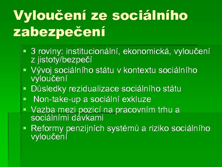 Vyloučení ze sociálního zabezpečení § 3 roviny: institucionální, ekonomická, vyloučení z jistoty/bezpečí § Vývoj sociálního státu v kontextu sociálního vyloučení § Důsledky rezidualizace sociálního státu § Non-take-up a sociální exkluze § Vazba mezi pozicí na pracovním trhu a sociálními dávkami § Reformy penzijních systémů a riziko sociálního vyloučení
