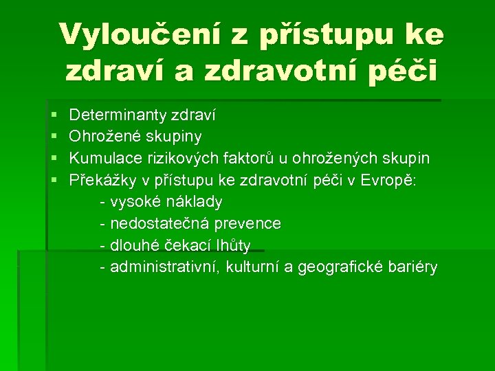 Vyloučení z přístupu ke zdraví a zdravotní péči § § Determinanty zdraví Ohrožené skupiny Kumulace rizikových faktorů u ohrožených skupin Překážky v přístupu ke zdravotní péči v Evropě: - vysoké náklady - nedostatečná prevence - dlouhé čekací lhůty - administrativní, kulturní a geografické bariéry