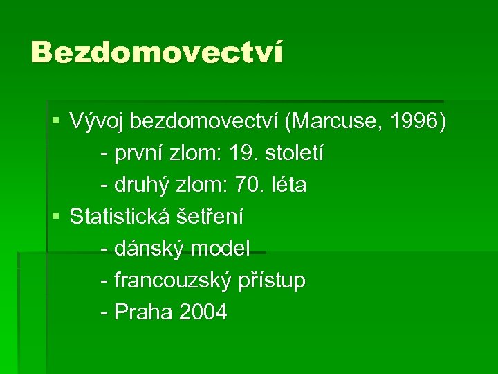 Bezdomovectví § Vývoj bezdomovectví (Marcuse, 1996) - první zlom: 19. století - druhý zlom: 70. léta § Statistická šetření - dánský model - francouzský přístup - Praha 2004
