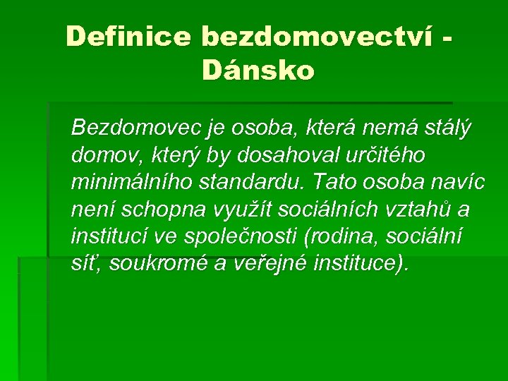 Definice bezdomovectví Dánsko Bezdomovec je osoba, která nemá stálý domov, který by dosahoval určitého minimálního standardu. Tato osoba navíc není schopna využít sociálních vztahů a institucí ve společnosti (rodina, sociální síť, soukromé a veřejné instituce).