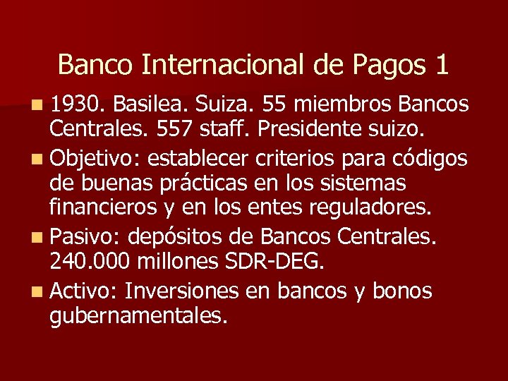 Banco Internacional de Pagos 1 n 1930. Basilea. Suiza. 55 miembros Bancos Centrales. 557 staff. Presidente suizo. n Objetivo: establecer criterios para códigos de buenas prácticas en los sistemas financieros y en los entes reguladores. n Pasivo: depósitos de Bancos Centrales. 240. 000 millones SDR-DEG. n Activo: Inversiones en bancos y bonos gubernamentales.