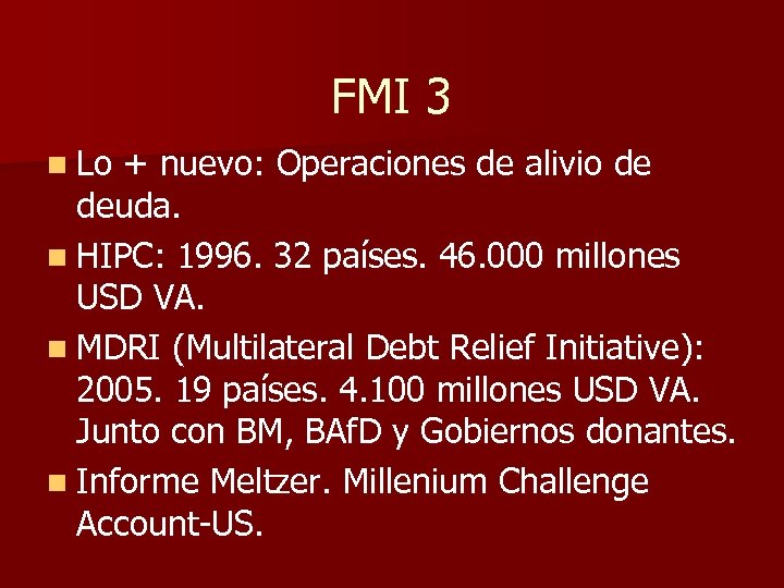 FMI 3 n Lo + nuevo: Operaciones de alivio de deuda. n HIPC: 1996. 32 países. 46. 000 millones USD VA. n MDRI (Multilateral Debt Relief Initiative): 2005. 19 países. 4. 100 millones USD VA. Junto con BM, BAf. D y Gobiernos donantes. n Informe Meltzer. Millenium Challenge Account-US.