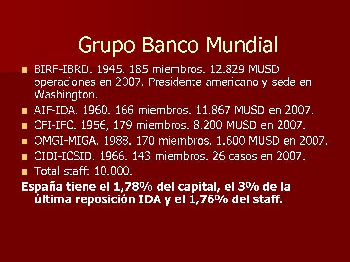 Grupo Banco Mundial BIRF-IBRD. 1945. 185 miembros. 12. 829 MUSD operaciones en 2007. Presidente americano y sede en Washington. n AIF-IDA. 1960. 166 miembros. 11. 867 MUSD en 2007. n CFI-IFC. 1956, 179 miembros. 8. 200 MUSD en 2007. n OMGI-MIGA. 1988. 170 miembros. 1. 600 MUSD en 2007. n CIDI-ICSID. 1966. 143 miembros. 26 casos en 2007. n Total staff: 10. 000. España tiene el 1, 78% del capital, el 3% de la última reposición IDA y el 1, 76% del staff. n
