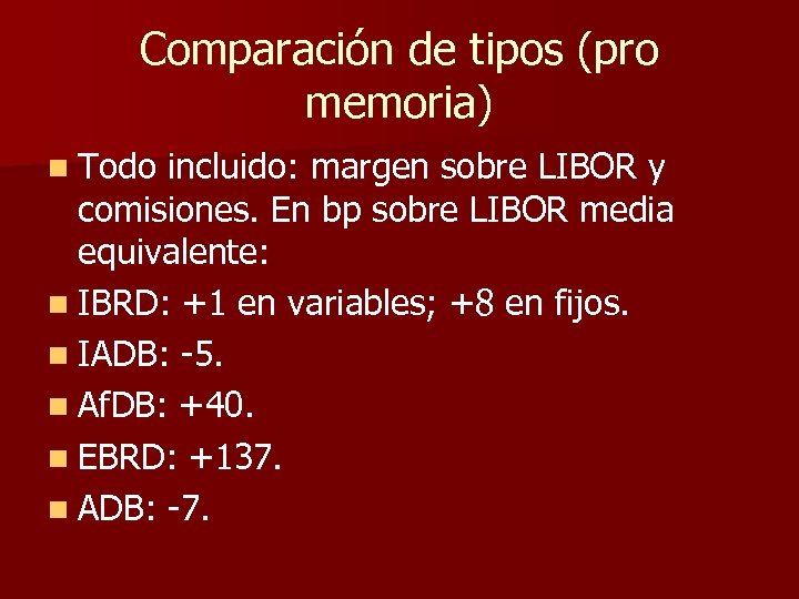 Comparación de tipos (pro memoria) n Todo incluido: margen sobre LIBOR y comisiones. En bp sobre LIBOR media equivalente: n IBRD: +1 en variables; +8 en fijos. n IADB: -5. n Af. DB: +40. n EBRD: +137. n ADB: -7.