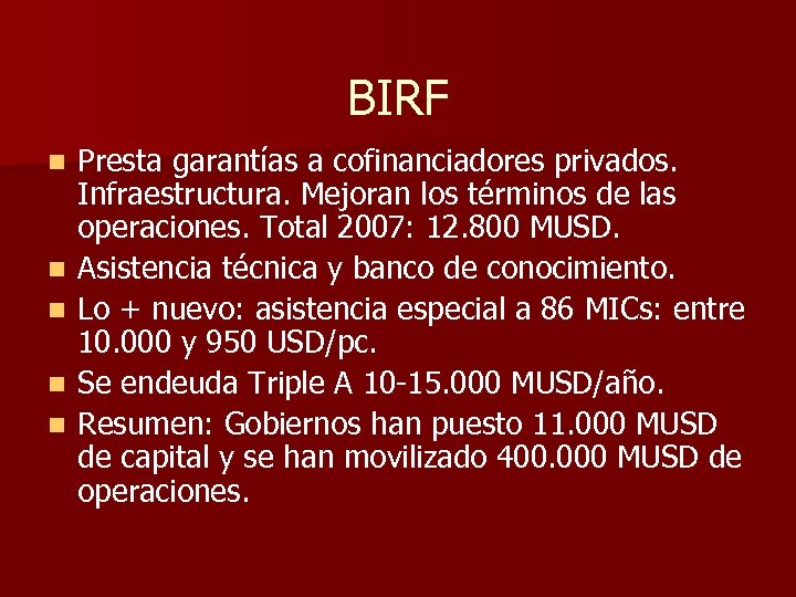 BIRF n n n Presta garantías a cofinanciadores privados. Infraestructura. Mejoran los términos de las operaciones. Total 2007: 12. 800 MUSD. Asistencia técnica y banco de conocimiento. Lo + nuevo: asistencia especial a 86 MICs: entre 10. 000 y 950 USD/pc. Se endeuda Triple A 10 -15. 000 MUSD/año. Resumen: Gobiernos han puesto 11. 000 MUSD de capital y se han movilizado 400. 000 MUSD de operaciones.