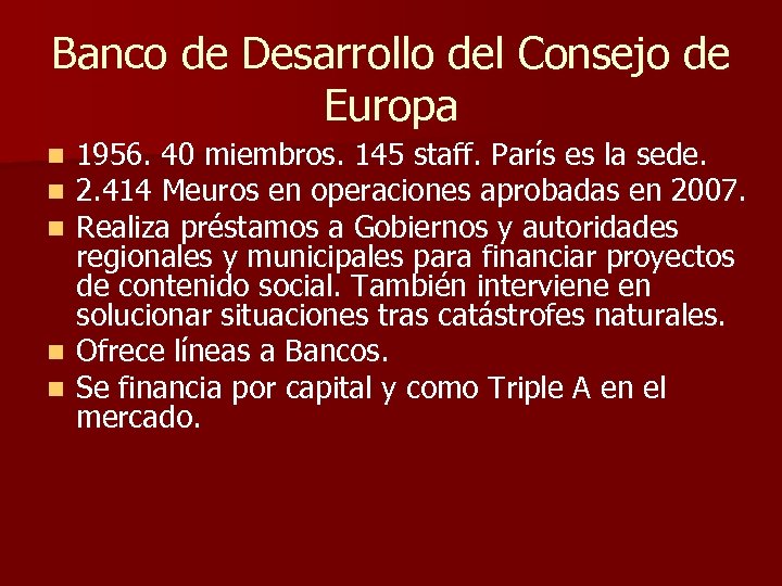 Banco de Desarrollo del Consejo de Europa 1956. 40 miembros. 145 staff. París es la sede. 2. 414 Meuros en operaciones aprobadas en 2007. Realiza préstamos a Gobiernos y autoridades regionales y municipales para financiar proyectos de contenido social. También interviene en solucionar situaciones tras catástrofes naturales. n Ofrece líneas a Bancos. n Se financia por capital y como Triple A en el mercado. n n n