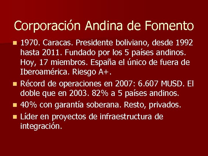 Corporación Andina de Fomento 1970. Caracas. Presidente boliviano, desde 1992 hasta 2011. Fundado por los 5 países andinos. Hoy, 17 miembros. España el único de fuera de Iberoamérica. Riesgo A+. n Récord de operaciones en 2007: 6. 607 MUSD. El doble que en 2003. 82% a 5 países andinos. n 40% con garantía soberana. Resto, privados. n Líder en proyectos de infraestructura de integración. n