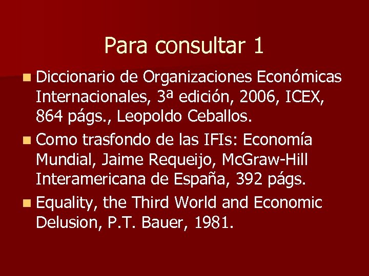 Para consultar 1 n Diccionario de Organizaciones Económicas Internacionales, 3ª edición, 2006, ICEX, 864 págs. , Leopoldo Ceballos. n Como trasfondo de las IFIs: Economía Mundial, Jaime Requeijo, Mc. Graw-Hill Interamericana de España, 392 págs. n Equality, the Third World and Economic Delusion, P. T. Bauer, 1981.