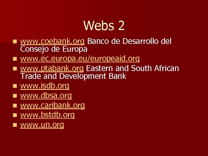 Webs 2 n n n n www. coebank. org Banco de Desarrollo del Consejo de Europa www. ec. europa. eu/europeaid. org www. ptabank. org Eastern and South African Trade and Development Bank www. isdb. org www. dbsa. org www. caribank. org www. bstdb. org www. un. org
