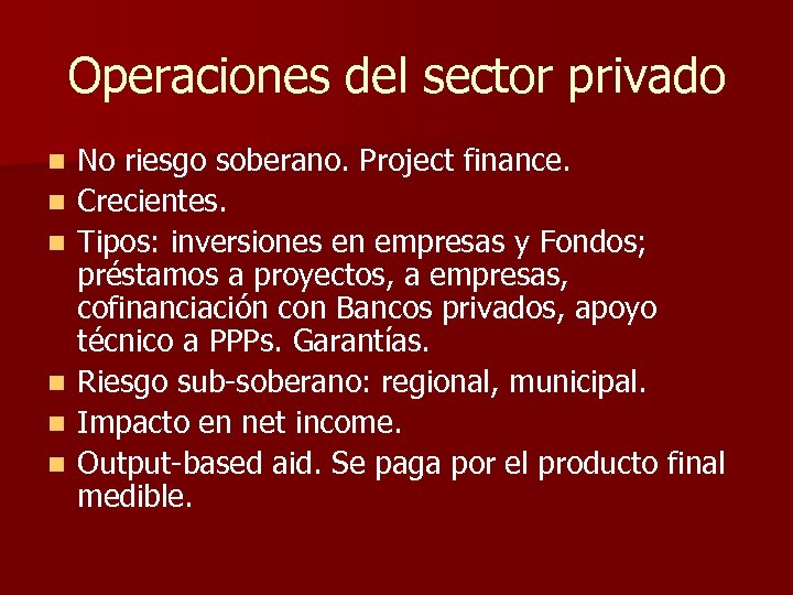 Operaciones del sector privado n n n No riesgo soberano. Project finance. Crecientes. Tipos: inversiones en empresas y Fondos; préstamos a proyectos, a empresas, cofinanciación con Bancos privados, apoyo técnico a PPPs. Garantías. Riesgo sub-soberano: regional, municipal. Impacto en net income. Output-based aid. Se paga por el producto final medible.